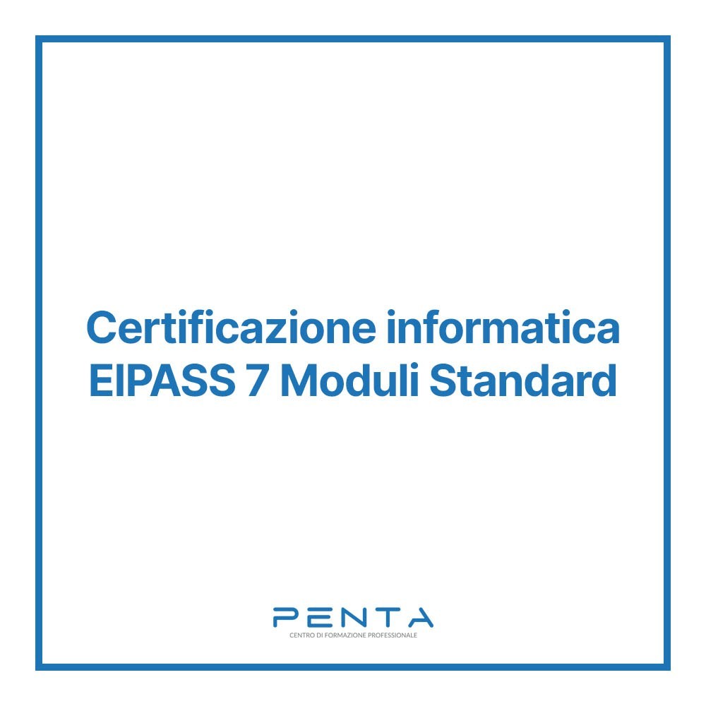 La certificazione internazionale di alfabetizzazione digitale EIPASS 7 Moduli Standard è in linea con le normative europee in materia, l’e-Competence Framework for ICT Users (e-CF) e il DigComp Framework, ed è riconosciuta dal Ministero dell’Istruzione (MIUR). Attesta il possesso ddi competenze informatiche di livello intermedio e rispetta le normative europee del Framework DigComp 2.2.